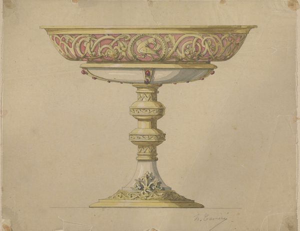 This print, made by Wenceslaus Hollar in 1646, shows a wide cup with an ornamental stem, likely crafted from precious metal. Prints like these were often made to circulate designs or to document prized possessions. Here, Hollar meticulously captures the cup’s complex form through the precise technique of etching, using line to define its contours and suggest volume. Consider the original object, almost certainly hammered, chased, and possibly cast. Each of these processes demands a high degree of skill and time. The cup itself, a luxury object, speaks to the conspicuous consumption of the wealthy. Hollar's print extends this economy, allowing the cup to be visually consumed by a wider audience. Prints like this one challenge the traditional hierarchy between decorative art and fine art. By documenting and disseminating designs, printmakers like Hollar blurred the lines, and allowed for a wider appreciation of the craftsmanship embedded in luxury objects.