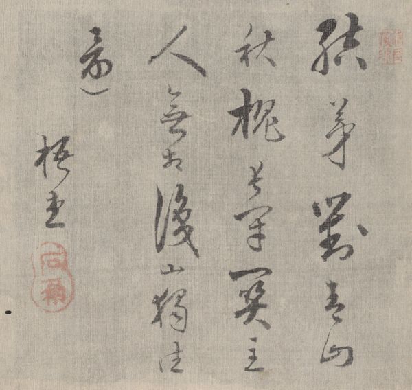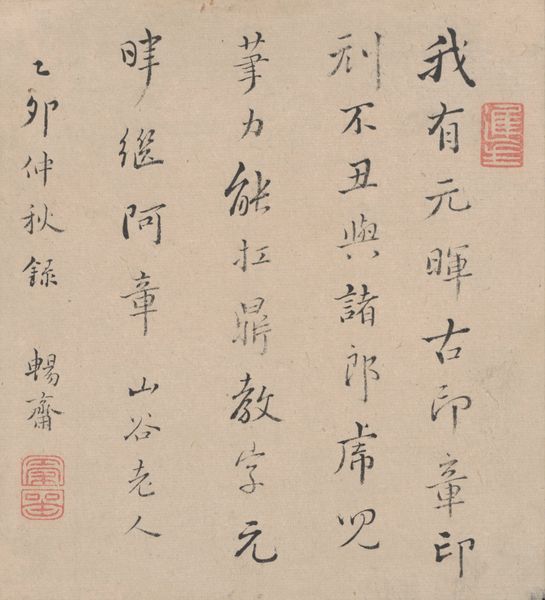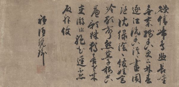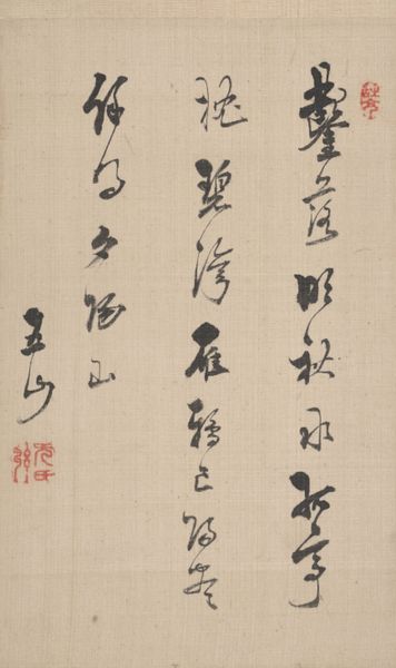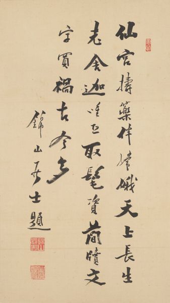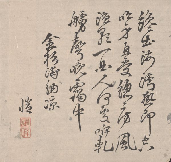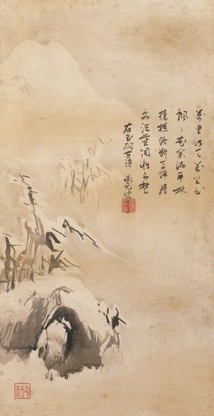 Editor: Here we have "Bamboo and Poem" by Murase Kōtei, dating to the late 18th or early 19th century. It’s an ink-on-paper drawing. The first thing I notice is how much the calligraphy dominates the image. The bamboo feels almost like an afterthought. What do you see in it? Curator: Oh, I’m so glad you said that! It feels almost like a dance between the visual and the literary, doesn’t it? Kōtei’s bamboo, so subtly rendered, is a quiet whisper against the bold declaration of the poem. It's as if he's inviting us to contemplate which holds more weight, the image or the word. Or perhaps… the space between them. Don't you feel a similar contrast between these elements? Editor: I do see that now! It’s like he’s using the image to almost… frame the poem? And the poem isn’t descriptive, necessarily. It’s more… reflective? Curator: Precisely! The poem amplifies the visual, offering not a description, but an echo of its spirit. And you know, in traditional Chinese and Japanese art, calligraphy wasn't just writing, it *was* art. Each stroke carries intention, emotion. Do you see the energy in the brushstrokes? How they vary in thickness and pressure? Editor: Now that you point it out, it looks as deliberate as the bamboo itself! It makes me wonder what Kōtei wanted viewers to feel. Curator: I think he invites us to meditate on the interconnectedness of all things – nature, art, poetry, self. Perhaps, he wants us to find the poem within the bamboo, and the bamboo within the poem. Or, if you prefer, that there's a geometric and a calligraphic nature, and one exists because of the other, in harmony and balance. Editor: Wow, I didn't expect to find such depth in what seemed like a simple drawing! Curator: And that, my friend, is the magic of art! It keeps unfolding if you let it.