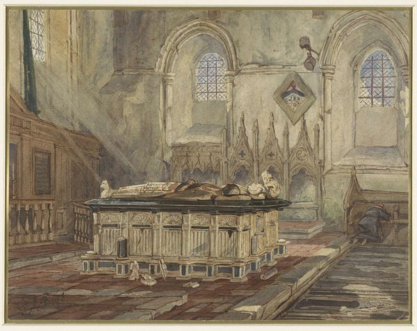 Rudolf von Alt rendered this watercolor of Emperor Frederick III's tomb in the Stephansdom in Vienna. Here, stone and light create a somber yet striking portrayal of eternal rest. Notice the arches supporting the tomb, a motif stretching back to Roman triumphal arches. These arches, symbols of victory and power, echo in later Christian architecture as portals to the divine, suggesting a transcendence from earthly life to eternal glory. Observe the repetition of the pointed arches and vertical lines, drawing the eye upward, reinforcing the church’s connection between earthly existence and the heavens. Consider how such elements of hope and continuity recur across cultures, reflecting a deep-seated human desire for meaning and permanence. These symbols create a non-linear, cyclical progression, resurfacing in different historical contexts, evolving to take on new meanings, yet retaining their capacity to engage our deepest emotions.