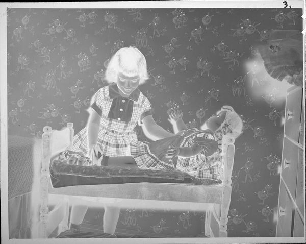 Curator: This is an Untitled work by Lucian and Mary Brown, a photograph, depicting a little girl standing next to a baby lying down. Editor: It has an eerie dreamlike quality with these inverted tones. The girl's smile feels almost unsettling. Curator: The image as a whole evokes a sense of domestic labor, the way the older child is already performing care, perhaps reflective of wider social expectations. The photograph itself, as a mass-produced object, democratizes image-making. Editor: Yes, I get that. It also speaks to me about vulnerability, these two figures juxtaposed in such a stark and unadorned manner. The floral patterned backdrop is just exquisite in its own right. Curator: Indeed. The backdrop points to the industrial production of textiles and the consumption practices of the time. Editor: So, it’s an unsettling family portrait of the era. Curator: Precisely. It’s more complex than just a simple photograph. Editor: I’m taking so much away from it. Thank you for your deep insights. Curator: My pleasure. It is a very interesting work.