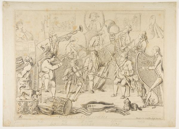 Curator: Giovanni David offers us a dramatic glimpse into "The Naval Battle of Meloria," dating from between 1743 and 1790. Executed in pencil, this drawing or print resides here at The Met. What's your initial take? Editor: Chaotic, almost feverish. The swirling lines and multiple perspectives create a sense of intense, overwhelming conflict. It feels like you're right there in the thick of it. Curator: It’s interesting how the composition almost bursts out from the center, expanding toward this suggested semicircle. David seems concerned with capturing the entirety of this significant historical event. He’s compressing space and time. Editor: It’s a history painting, yes, depicting the 1284 battle between Genoa and Pisa. Look how the bodies are tossed about—they don’t read as heroic victors, but rather, vulnerable beings at the mercy of larger forces. What symbolism might be at play here? Curator: The battle itself became a symbolic event for Genoa, representing their ascendancy and the decline of Pisan power. The crowded composition, with ships and figures enmeshed, could speak to the interconnectedness of power, trade, and ultimately, the human cost of ambition. I’m also struck by how David leaves certain elements unfinished, almost ghostly. Editor: Precisely. The open linework almost allows us to fill in the gaps, implicating the viewer in the creation—or perhaps the recreation—of this historical narrative. It emphasizes the human tendency to remember, embellish, and, potentially, mythologize events. Curator: In some ways, it captures the inherent instability of historical memory. It isn’t just about a victor and vanquished; the symbolic value continues shifting and morphing across the years, just as the sketch itself feels transient. Editor: A fascinating commentary on the subjective nature of victory and defeat, power, and remembrance—all wrapped in this incredibly dynamic composition. I think David reminds us that history is never truly settled.