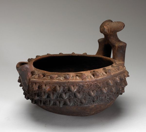 Curator: Allow me to introduce a fascinating object: a bronze, three-wick lamp created around 1500 by Andrea Briosco, also known as Riccio. Notice the intricate Bacchic scenes adorning its surface. Editor: Woah. My first impression? Pure decadence. I mean, look at it. The dim light it casts must feel like a velvet curtain closing in around you. You can almost smell the spilled wine and hear the low laughter of secret gatherings. Curator: Precisely! Lamps like this, produced during the Italian Renaissance, were not merely functional; they were symbols of status, intellect, and a deliberate engagement with classical antiquity. This piece revives pagan imagery in bronze. Editor: Totally! Imagine stumbling through a Renaissance salon after a night of carousing, lit by this tiny inferno... All those muscled bodies intertwined in bas-relief… a hedonistic trip. This artwork screams of the rediscovery of earthly pleasures! Curator: Indeed. The choice of Bacchic scenes, depicting revelry and wine, would have resonated with a learned audience, reminding them of the virtues and vices celebrated in ancient literature. The political power of an individual who could acquire and curate something so clearly opulent should not be understated. Editor: I can imagine powerful hands owning this piece. Its miniature scale makes you want to hold it close, like a delicious secret only a few are permitted to glimpse. Sort of an emblem for those enjoying wealth. It’s like owning a piece of the ancient party, right here. Now! Curator: Yes, you touch upon something important. Collecting these bronze artworks was as much about asserting cultural dominance as it was about personal pleasure. The sculptures reflected taste but also served as conversation pieces for erudite gatherings within affluent circles. Editor: Knowing this lamp probably illuminated countless conspiratorial whispers gives me shivers. So cool to realize its role in so many significant conversations! I might have imagined them to be all dancing and singing at the beginning. Curator: Thinking about Riccio’s lamp offers insights into how Renaissance elites understood and deployed the classical past. These lamps helped them reflect the present and its challenges, not as imitations but rather in active dialogue. Editor: Thanks. This thing went from a pretty object to something charged and complex! This encounter reframes my assumptions about value. Thanks.