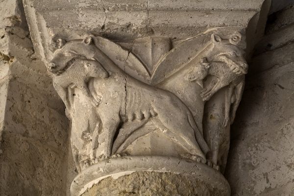 This column capital was carved in stone as part of the Romanesque architecture of Grande Sauve Abbey in France. The capital is adorned with roaring lions flanking a central human figure, motifs potent with symbolic weight. The lion, a symbol of strength, courage, and royalty, frequently appears in ancient Near Eastern and biblical art, often guarding sacred spaces. In contrast, the human figure, possibly a prophet or king, symbolizes divine authority or spiritual guidance. This echoes the ancient Mesopotamian lamassu figures, winged bulls or lions guarding palace entrances, intended to ward off evil and assert power. The tension between the protective, almost aggressive posture of the lions and the serene, dignified stance of the human figure creates a powerful psychological dynamic. It speaks to the ever-present human desire for security and spiritual leadership, a theme that continues to resurface, evolving in form but consistent in its emotional resonance, throughout the history of art.