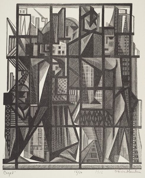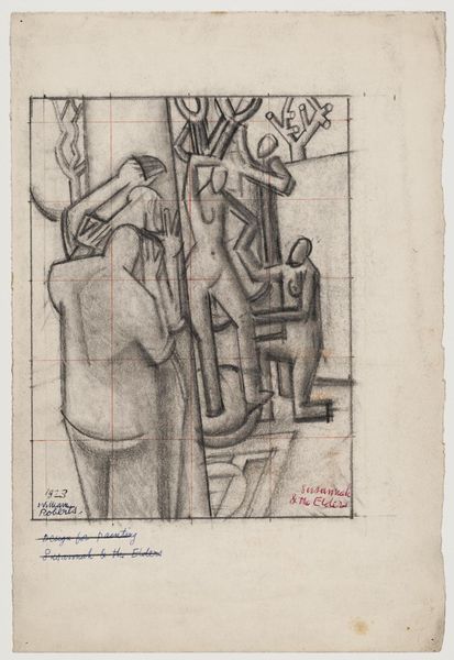 Curator: Karl Wiener's pencil drawing, "Das vergewaltigte Recht"—"The Violated Right"—presents an unsettling vision. The lack of a specific date invites us to consider its timelessness. Editor: My initial impression is one of stark geometry and disturbing tension. The rigid lines create a claustrophobic feeling. There's a sense of coldness to the whole composition. Curator: This piece emerges from a social-realist and expressionist tradition. It compels us to think about power, particularly masculine power, and its capacity for injustice against women. The symbolism is quite overt. Editor: Indeed. Structurally, the artist has placed a looming guillotine in the background. Its sharp, geometric form dominates the composition. Visually, the weight of the impending blade contrasts with the lightness of the skirt on the blindfolded woman. It’s a clear semiotic signal. Curator: The blindfold becomes a key element, doesn't it? Who is blindfolded and who perpetrates violence? Where is justice in all of this? I believe the rigid man on the left underscores the cold detachment often found in systems that uphold injustice, notably patriarchal structures. His very posture drips with disdain. Editor: Agreed. I think there is some irony in how geometric forms like these that are traditionally associated with precision are here employed to depict such an obvious moral and political imbalance. What is the building looming behind them, do you think? Curator: I read that as a symbol of established order—the courthouse, the seat of power. Yet, perverted, obviously. It stands as a stark commentary on the fragility of justice within societal constructs. Editor: On balance, considering Wiener's calculated use of form and space and your insights, I think "The Violated Right" creates a powerful—though discomforting—image, a reminder of institutional perversion of societal order. Curator: Ultimately, it urges a profound societal interrogation, calling out the gendered aspects of power and the urgency for social responsibility.