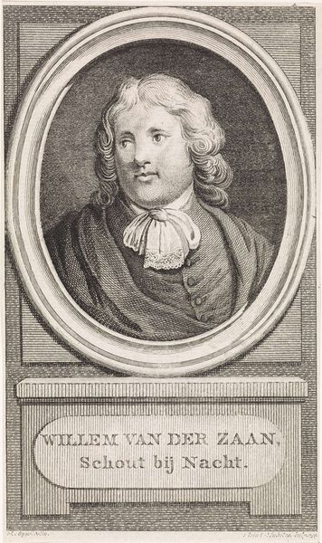 This is Reinier Vinkeles's "Portret van Willem van der Zaan" printed with etching around the 18th century, now at the Rijksmuseum. The print shows Willem van der Zaan encased in an oval frame, which is placed atop a rectangular pedestal. The piece uses line and form to construct the figure, and the composition is rigidly symmetrical. This symmetry speaks to the Enlightenment values of reason and order that were ascendant during the period. The etched lines create a sense of depth, but the overall flatness of the composition also nods towards the limitations of representation and the constructed nature of images. The use of the oval frame is also notable. It sets the portrait apart, suggesting a defined space for the subject's identity. The sharp geometric forms of the rectangle contrast with the curve of the oval, creating tension and drawing attention to the constructed nature of the portrait itself. The print destabilizes notions of fixed identity and representation, hinting at the complexities beneath the surface.