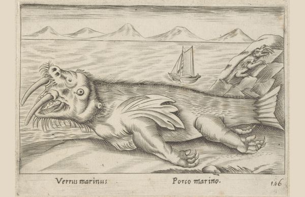 Curator: I find the starkness of this engraving so compelling. Look at the contrast of light and dark, the animal rendered with such precision, despite being, well, a sea calf. Editor: I’m struck by the quality of the line work. Antonio Tempesta created this print before 1650; can you imagine the labor involved? The minute cross-hatching suggests the animal's skin, but also, importantly, shows an expertise in materials readily at hand and widely traded, highlighting an artist working within both the physical constraints and broader mercantile context of the era. Curator: It’s an interesting contrast to the animal’s situation, stuck between environments. The Baroque era did have this thing of ordering and classifying the world in an attempt to put everything in its place and give meaning, but prints like these ended up circulating widely, and reshaping worldviews and creating new social dynamics by disseminating ideas and information on a mass scale. It’s amazing to me that a little “sea calf” could embody this kind of transformative power. Editor: Absolutely. I wonder about the engraver's tools. What kind of burin was used to get such fine lines? And what kind of paper received the ink so well? Was the print intended as a study? I'm less interested in Tempesta's intentions than in how these materials mediate his engagement with the natural world. A natural wonder translated through artisanal knowledge. Curator: That makes me consider the contemporary impact, and how, as a multiple, prints like this one were sold and traded, informing social norms, class relations, and influencing our own gaze. What about the broader socio-political landscape—might prints like these feed a kind of anthropocentrism that justifies our separation from, and thus exploitation of, the natural world? Editor: Well, and let's consider the audience too, who would've seen and understood this print. Were these the elite and wealthy, or a rising merchant class seeking new horizons and investments? That level of consumerism becomes tied to the material and manufacture itself, impacting production methods. Curator: It leaves me thinking about the interplay of knowledge, power, and image-making in that period. The natural world reduced to ink and paper—circulated and consumed—is potent stuff. Editor: For me, it prompts thinking about the artist's knowledge, their craft—a connection across time, expressed in the lines of a calf at the edge of an early modern world.