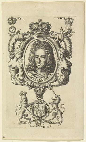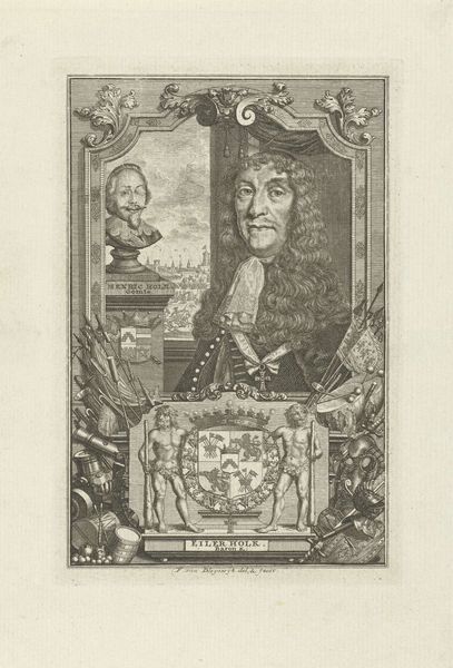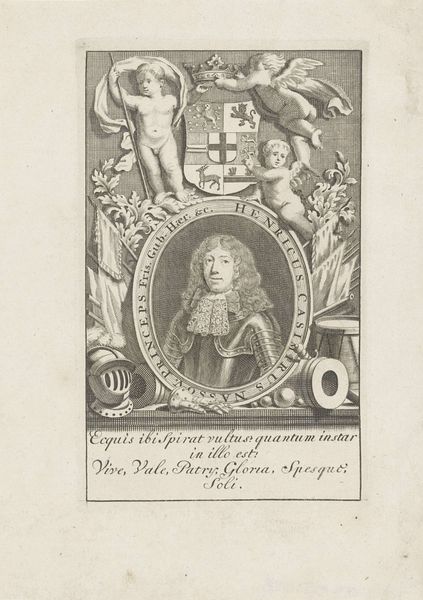 Curator: Up next, we have a meticulously rendered engraving, "Portret van Hendrik Danielsz. Hooft," created sometime between 1787 and 1794 by Noach van der (II) Meer. The piece resides here at the Rijksmuseum. What strikes you most about it? Editor: It’s the precision! You can practically feel the engraver's hand, the controlled pressure needed to carve these lines into the plate. It gives a sense of the sitter's social position – the wig, the formal attire – a clear symbol of power, laboriously constructed through artisanal means. Curator: Absolutely. The circular frame embellished with radiating motifs and topped with a ribbon further reinforces this sense of controlled presentation and hints at Neoclassical influences, emphasizing order and reason, reflecting Enlightenment ideals of the period. It's a portrait of importance and status. Editor: Status is clearly materialized here! It speaks volumes about the engraver's skill, the printing process itself. Each print would have taken significant time and labor, transforming the sitter into a sort of reproducible commodity of influence. We also can wonder where the paper came from for this! Curator: A fascinating point about commodification! It shifts my perspective to consider how widely images, such as this one, contributed to maintaining established social order. The ribbon itself adds an additional symbolic layer: maybe it represents honour, decorum and elegance. Editor: It's also striking that such a formalized image is created with manual tools: a complete contrast. How long did this labour take? How expensive was the equipment? Engraving highlights the labor hidden within "fine art", allowing more material investigation. Curator: You make it impossible not to think about this. What was once perhaps simply an honorific image transforms into an assertion of power sustained by labor and materiality, shaped and circulated throughout its specific context. Editor: Precisely! It forces us to think beyond the individual portrayed and examine the wider context of production and social impact. Curator: An image to contemplate indeed. Thanks for drawing out the image this way.