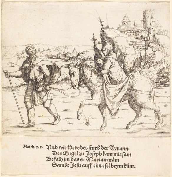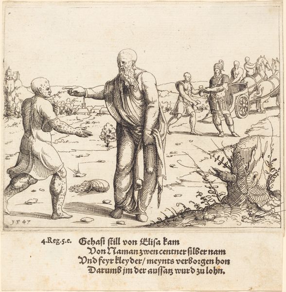 Augustin Hirschvogel created this print of Joab betraying Abner, using etching, sometime in the mid-16th century. It’s all about the line here: notice how the artist has used it to create volume and texture, conjuring forms from thin air. As a print, this image exists in many identical copies – a relatively inexpensive artwork intended for broad circulation. That fact gives it social significance. This wasn't a unique painting made for a wealthy patron. Instead, it was produced in multiples, expanding access to art beyond the elite. The fine, detailed linework speaks to the artist’s hand-skill, and the amount of labor involved in the etching process, using acid to bite lines into a metal plate. This print bears witness to the changing modes of production, as traditional craft practices meet new possibilities of distribution. It’s a potent reminder that art doesn't exist in a vacuum; its meaning is deeply intertwined with the social conditions of its making.