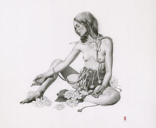 Soey Milk made this drawing called Cuddlefish with graphite on paper and it shows the most extraordinary, subtle approach to mark making. It’s like she’s coaxing the image into being with the lightest of touches. I love how she builds up the image with delicate lines, almost as if she’s sketching out a thought. The surface of the paper remains visible, giving the drawing a sense of airiness. Look at the way she renders the woman’s clothing with intricate patterns and textures. There is one small area, toward the bottom right, where Milk uses red ink to create a small cluster of shapes, like a visual exclamation point. I’m reminded of Egon Schiele, but with a gentler touch, and maybe a bit of Aubrey Beardsley. I think these sorts of drawings remind us that art is a language and conversation across time, and that there’s no one right way to see or interpret a work of art.