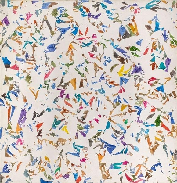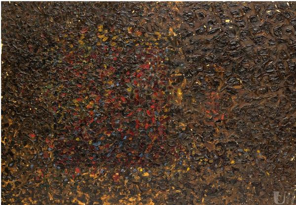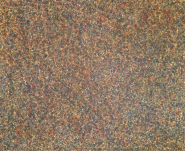 Curator: Pablo Rey's "Espacio modificado #25," created in 2002, presents a fascinating field of textured interactions. Editor: It has a nervous energy. My first impression is almost geological; I'm reminded of shale, some kind of stratified rock face worn away by water. All those little rivulets of color. Curator: That resonates. Consider the title, "Modified Space." I see the process as one of intervention and alteration of a surface. Rey seems to be engaged in a conversation with materials— exploring what paint can *do*, how it can accumulate and interact. Editor: The individual color shapes, are they just colors, or are they also alluding to a language of symbols, little glyphs whose meanings we can no longer read, scattered by the passage of time? I feel like each mark has the potential for narrative. Curator: Or maybe each mark simply is what it is – a direct result of Rey's physical engagement with the canvas, the viscosity of the paint, the angle of the brush. I wonder about his studio practice. Was this impulsive, or meticulously planned? Is he building up layers or carving away at a pre-existing ground? The layers become a record of those actions. Editor: Perhaps a bit of both? But those scattered yellow ochre fragments—aren't they reminiscent of broken halos, all that remains of vanished saints, stripped of their devotional context and disseminated into abstraction? Curator: It's interesting to imagine this as sacred wreckage, though I'm inclined to see them as just paint. Perhaps remnants from previous artworks reworked or repainted into an abstract form. Rey repurposing the studio leftovers. Editor: Still, even "just paint" carries the history of its pigment. Consider how that pigment was sourced, what its use signifies. So, perhaps its layered history tells a cultural story even when he's not actively trying to encode that. Curator: Exactly. "Espacio modificado #25" encapsulates the transformative power of art-making itself and questions artistic boundaries. Editor: I will think about shale strata and broken halos for quite some time.