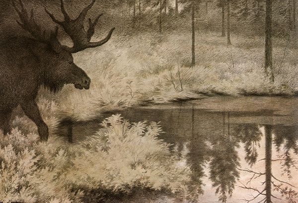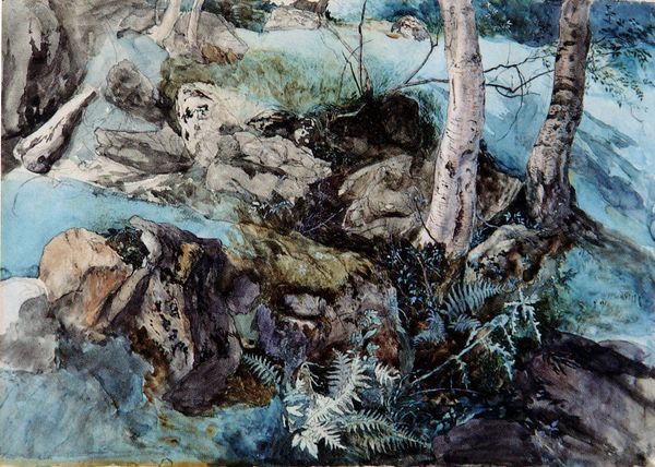 Curator: Winslow Homer’s watercolor, *A Good Shot, Adirondacks,* completed in 1892, throws us headfirst into the wilds of the American landscape. What strikes you immediately? Editor: It’s the drama of survival painted in swift strokes. The looming night, a silvery moon fighting through heavy clouds… then you see it, the focal point, two deer caught mid-struggle on a rock amid raging waters. It’s quite elemental and stark, the energy! Curator: Indeed. Homer often used animals as stand-ins to explore universal themes – life, death, struggle. Think of the deer, for example, rooted on that rock as they strain to break free. Consider, too, that Homer, at this point in his life, had spent long periods studying animal behavior; what do you suppose it communicates, beyond the purely representational? Editor: Perhaps about primal instincts and the competitive drive so ingrained in both humans and beasts. It seems relevant considering the economic competition prevalent during the late Gilded Age. The deer in Homer's hands also take on symbolic dimensions related to the hunt and nature in American mythology. Curator: Absolutely. The watercolor medium allows Homer to create translucent washes, building depth and capturing the dynamism of the natural environment. Look how he merges light and shadow to suggest the sublimity of nature and man’s precarious place within it. The bleed effect enhances that atmospheric pressure. In many ways, the romantic-era painters set the stage for Winslow; without that aesthetic infrastructure, he wouldn’t be Homer, no? Editor: That reminds me, it also forces the viewer to consider their own moral perspective and maybe question humankind's part in this ruthless dance with nature. It's a potent comment about hunting traditions. Curator: Certainly! Through his skilled manipulation of watercolor, Winslow captures a primal struggle in the heart of the American wilderness. It's an incredibly moving piece that leaves you with many ideas regarding identity and morality. Editor: Agreed! *A Good Shot, Adirondacks* stays with us long after we’ve left it, revealing how much Homer can accomplish with sparse figures and open-ended compositions.