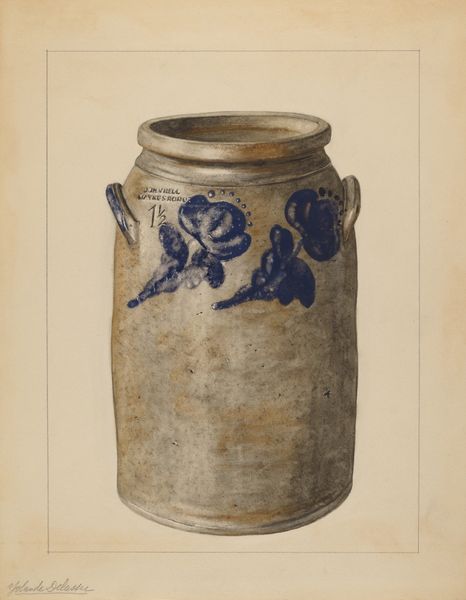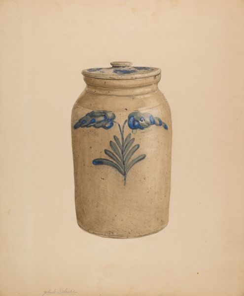 Curator: My initial impression is a feeling of serene containment. There's something comforting in the muted palette, the soft rendering of the stoneware. Editor: Indeed! What we're observing is Yolande Delasser's artwork, titled "Jar," created circa 1938. The artwork is a sophisticated exploration in charcoal and watercolour on paper that embodies a gentle realism. These forms can hold memories as much as practical materials. Curator: Absolutely. A jar, beyond its utility, signifies preservation—of food, perhaps, but also traditions, histories. I see a deliberate rendering of texture, those subtle variations across the surface of the jar suggest weathering, a story of use and time passing. Editor: Notice how the blue leaf-like designs punctuate the earthy tones. These are not mere decoration, they seem to hint at growth, a natural counterpoint to the jar's manufactured form. They carry echoes of ancient decorative motifs, echoing traditions far beyond their immediate time. Curator: I find it fascinating how a simple, everyday object becomes a vessel for complex meanings. Does it evoke a sense of nostalgia for you? It certainly stirs a gentle ache in me for a time I never knew, perhaps an imagined pastoral past. Editor: The interplay of earth and sky reflected in the vessel—the earthy browns, contrasted with vivid leafy strokes. It almost presents a self-contained little cosmos, the human element striving for balance with nature. The muted, almost faded quality suggests a shared but subtly altered past that is preserved as memory. Curator: And perhaps that is the enduring power of art—to transform the mundane into the extraordinary, the fleeting into the eternal. An archetypal emblem—this Jar—holding the world. Editor: Agreed, let’s think about the journey of meaning an object holds across history. What once was created practically evolves to evoke nostalgia in our contemporary era.