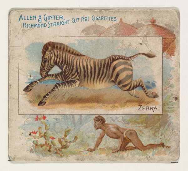 Editor: This is "Tapir, from Quadrupeds series (N41) for Allen & Ginter Cigarettes," a watercolor and print from 1890. It’s part of a series, and something about the way the animal is situated in the landscape feels both exotic and a bit unsettling. What do you see in this piece, especially given its origins as a cigarette card? Curator: I see a potent intersection of commerce, colonialism, and the construction of knowledge. These cards, meant to stiffen cigarette packs, were also tools of popular education, shaping perceptions of the world. The “Quadrupeds” series, in particular, speaks to a Western impulse to categorize and possess the natural world. Editor: So, it's more than just a picture of an animal. It has deeper implications? Curator: Absolutely. Consider the context: late 19th century, height of colonial expansion. The tapir, an animal likely unfamiliar to most Western consumers, becomes a commodity, packaged and sold alongside cigarettes. It's a form of cultural appropriation, reducing a complex animal to a mere spectacle for consumption. What's your perspective on this, given your knowledge of post-colonial studies? Editor: I hadn't thought about it like that, but I agree. Seeing it framed as a collectible item normalizes a power dynamic where the West has authority over nature and the rest of the world. It’s like saying, "we can own this, too.” I see the way "orientalism" is coded here. Curator: Precisely. The seemingly innocuous image reinforces a worldview that naturalizes Western dominance. This small card is actually a powerful window into the ideology of its time, demonstrating how consumer culture can perpetuate skewed cultural narratives. How does acknowledging that context change your viewing experience now? Editor: It’s made me realize I have to look beyond the surface, questioning how images, even ones that seem innocent, can carry so much cultural baggage. Thanks! Curator: And for me, it's a reminder of the ongoing need to decolonize not just institutions, but also our ways of seeing. These small objects really pack a punch.