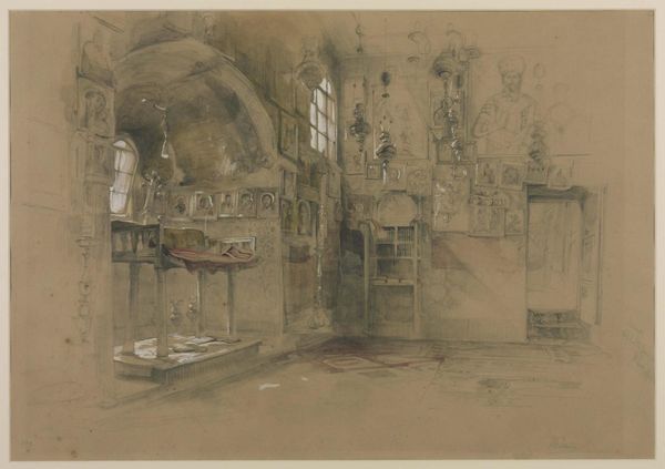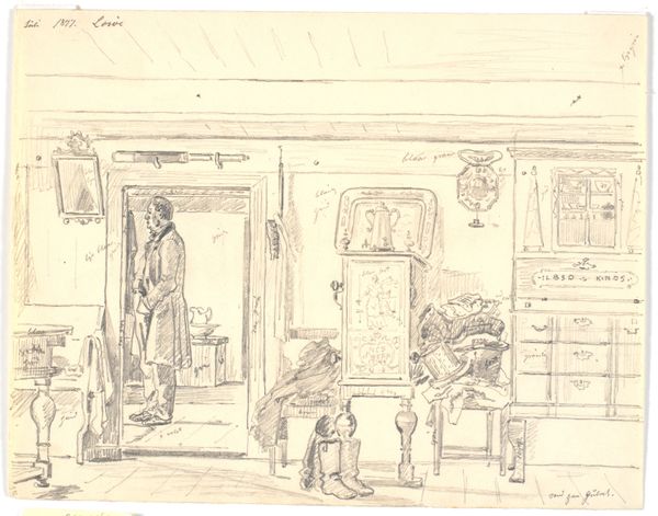 Curator: This atmospheric drawing, aptly named "Interieur van een synagoge," offers us a glimpse inside a 19th-century synagogue, courtesy of Johannes Bosboom, a Dutch artist active between 1827 and 1891. It is held within the Rijksmuseum collection, rendered in ink and etching techniques. Editor: What strikes me immediately is the sense of quietude, even solemnity, despite the rather gestural, almost hasty, quality of the linework. It is almost monochromatic with layered gray scale of the architectural features and interior fixtures that add a ghostly aura. Curator: Absolutely, Bosboom really captures a sense of lived space with those seemingly rapid lines. Though he's known for his realism, this particular work has an almost impressionistic feel with details blurring at a closer range and taking hold into sharper angles from afar. You see a world defined by belief. What are some symbols and images you see speaking to those beliefs? Editor: The high windows suggest aspiration, the pursuit of something elevated. The pillars, though sketchy, give the drawing a clear and confident sense of scale. Even the lone figure evokes cultural memory for viewers, as he stands in quiet prayer. Overall, it's about history and spirituality, rendered beautifully in simple etching and line. It also speaks volumes about sacred space as something intimate, personal. The artist does this successfully because of a clear sense of interior depth and three point perspective with the subject front and center in clear light. Curator: I couldn't agree more. And it's this intimacy juxtaposed with the grandeur of the architecture that makes the image so compelling. There is the artist himself quietly interpreting this house of worship. Perhaps he found not only quiet reverence, but also an element of personal expression that lives on here, centuries later. Editor: Indeed. Looking at Bosboom's rendering, I’m reminded how much visual weight these architectural choices possess – how ceilings lifting upwards guide thoughts heavenward, or how the sparse arrangement echoes the need for interior reflection and silence. These interiors hold centuries of collective meaning and personal transformation.
