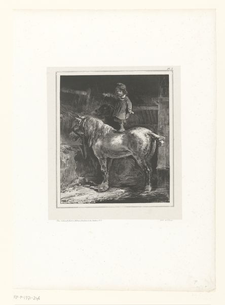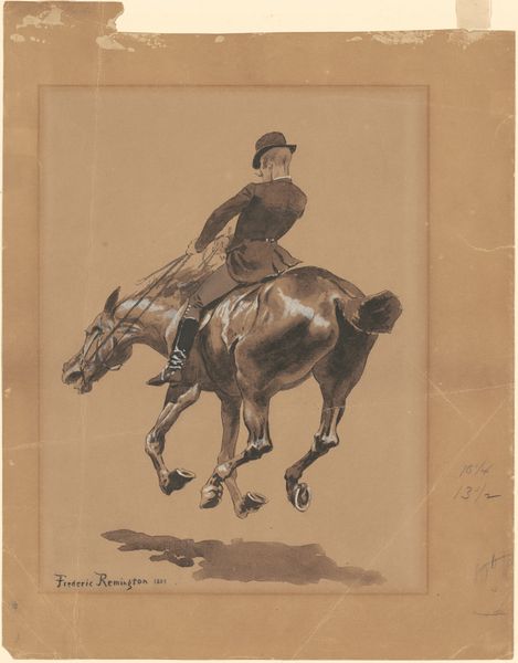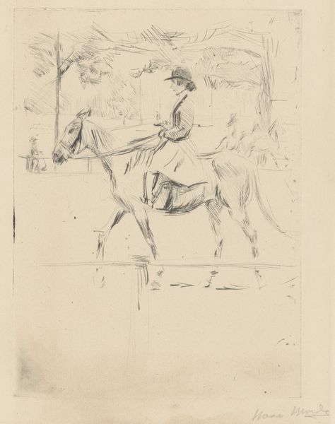 Editor: This is John-Lewis Brown’s "Woman on Horseback," made sometime between 1847 and 1890. It’s an etching, and it feels so delicately rendered. I’m curious about the subtle erotic undertones. What catches your eye? Curator: The setting and the subject position it firmly within a specific social milieu of the time, doesn't it? Consider the rise of the bourgeoisie and their leisure activities. Horseback riding, especially for women, was becoming a fashionable pastime. How might this artwork reinforce or challenge the social norms of the era? Editor: So it's about class and status? The leisure aspect makes sense. But "erotic art"? Is it pushing against conservative expectations by sexualizing horseback riding? Curator: It's important to recognize how representations of women, particularly in art intended for private consumption like prints, often reflected and reinforced societal views, particularly surrounding female sexuality and control. Consider her attire, posture, the implied gaze. It hints at societal expectations while possibly subtly challenging them. Could it be argued that portraying a woman so leisurely, outside, astride such a powerful animal represents an attempt to grant some agency to a figure otherwise socially confined? Editor: I didn't really notice those things before! It's like it has layers of meaning depending on your perspective. Thanks for highlighting the subtle cues, and how it reflected the society of the time. Curator: Of course. Considering artwork as products *of* their social times helps us view the image from new angles, questioning assumptions, and expanding on previous assumptions.