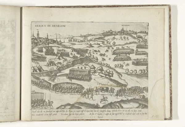 Curator: It feels… tense. A controlled chaos in miniature, wouldn't you say? All those tiny figures poised like chess pieces before the storm breaks. Editor: Well, look at the lines; there’s such precision. We're examining an engraving, and a pen and ink drawing dating back to somewhere between 1572 and 1574, titled "Roermond door Willem van Oranje ingenomen, 1572" – so, "Roermond Taken by William of Orange, 1572." A historical record presented as…craft? Curator: Craft elevates the historical, surely? I’m picturing the artist, some anonymous soul hunched over their workbench translating this grand historical drama into something hand-sized. They weren’t just documenting, they were also distilling the moment down to its essence. All the energy caught within those thin lines... Editor: Anonymous makes perfect sense, doesn't it? Mass production, circulation…the print exists to convey a specific piece of information, to generate public opinion – but, given what the printing press allowed, do you consider it more political tool, or propaganda? Curator: Oh, a bit of both, perhaps? It’s a record but tinged with perspective and passion. If it wasn’t intended to sway, why go to the lengths of illustrating this grand city conquest so? Look, it almost romanticizes war with those meticulously shaded hills in the background, beyond all the weaponry. Editor: Well, war is industry, and you see that plainly in the careful depiction of those siege engines, all of the soldiers rendered with that much clarity... Consider what it would take to arm, clothe and feed just one of these tiny figures—all of the networks of labor. The amount of coordination...It's almost unfathomable from our vantage point. Curator: I hadn’t quite considered that: the human cost isn't rendered with same meticulous attention. Instead, the people become like any other element; trees or hills in this intricate stage-set... Editor: Which, ironically, brings us back to the skill involved. All that cross-hatching... Those lines were created via intense physical labor. It may be about history, but its own means of production are history, too. Curator: It's striking to see it as both epic in scale and intimate in detail. To think, someone labored over every line, wrestling history down onto a single page. Editor: Precisely, and that single page has weight, even now. Thank you for sharing the experience with me! Curator: And thank you for helping me ground this grand image in all its making, reminding us how stories and power intertwine, even in ink.