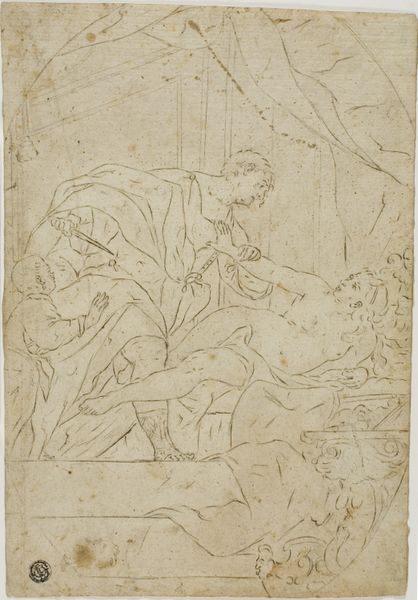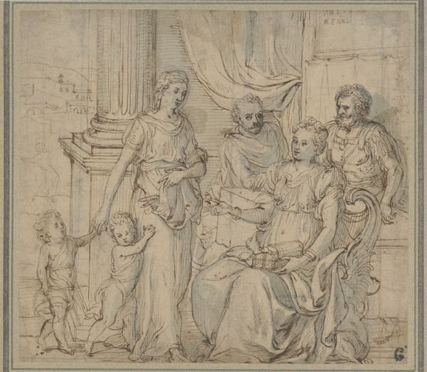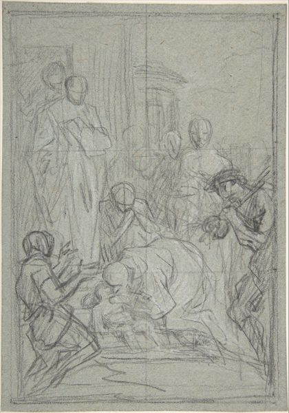 Editor: Here we have "Holy Family with the Infant Saint John the Baptist and Two Male Saints," a pen, ink, and graphite drawing on paper by Alessandro Albini, undated. The composition is really active with lots of figures. What symbolic readings do you take away from this piece? Curator: Look at the recurring motifs: The embracing infants, for example, not merely a charming depiction of childhood innocence. Rather, an intimation of sacrifice, destiny. This prefigures the relationship between Christ and John as the Lamb of God. What emotional register does this create for you? Editor: It feels like it anticipates the weight of religious expectation. It is pretty heavy. And the two other male saints on the sides, looking so grave, amplifies that. Curator: Precisely. Even their placement - framing the central figures – invites consideration. Consider their role: witnessing, affirming, perhaps even subtly questioning. What stories do their faces tell you? Do you think it offers alternative views within the canonical scene? Editor: I'm struck by how the use of pen, ink, and graphite softens the holy narrative into something more human. Curator: Indeed. Albini uses accessible imagery. And note the paper: its own history imprinted by the grid lines and the artist’s delicate touches, and invites a viewer into its sacred space. Editor: That’s really helpful. I never really thought of it in this way before, seeing those elements as a visual key. Curator: Art constantly speaks through time and across cultures using those keys. Being observant, seeking understanding, opens up that channel of communication with artists and viewers across centuries. Editor: I am going to remember that from now on. Thank you!