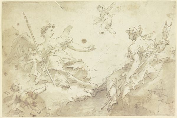 Editor: So, here we have Daniel Seiter's "The Rape of Helena," dating roughly between 1647 and 1705. It’s an ink drawing on paper. What strikes me is the dramatic, almost theatrical quality, even in this preparatory sketch. What do you see in this piece? Curator: Beyond the immediate drama, I see layers of cultural memory embedded in the scene. The "rape" of Helena, as the abduction is traditionally termed, is a pivotal moment leading to the Trojan War. It represents not just a physical act but a clash of civilizations, a disruption of cosmic order. It’s fascinating how Seiter uses classical realism to depict such a volatile narrative. What do you make of the figures, their poses? Editor: Well, the male figure pulling Helena from the boat definitely commands attention. There's an urgency in his gesture, but I also see a degree of vulnerability in Helena's expression. And what about that figure in the upper right riding the chariot? Is that another symbolic representation? Curator: Precisely! That could be a veiled reference to Venus, perhaps complicit or even orchestrating this event, playing on the complex themes of desire, fate, and divine intervention. Symbols aren’t always straightforward; their power lies in their layered meanings that cultures continually reinterpret. Does that reading shift your initial perception? Editor: Absolutely. Knowing that, I now see a deeper level of interpretation – the abduction isn't just a historical event but also a symbolic one, weighted with historical and psychological consequences, and, strangely, an almost sanctioned violence by Venus, god of love. Curator: Exactly. The continuity of these classical narratives lies in their potent symbols, shaping how we understand power, beauty, and conflict, generation after generation. Editor: It’s amazing how a simple ink drawing can hold so much weight and symbolic power. I will think twice when I next consider the idea of 'cultural memory' too! Curator: Indeed! It's a journey through art, revealing the enduring language of symbols and their lasting relevance.