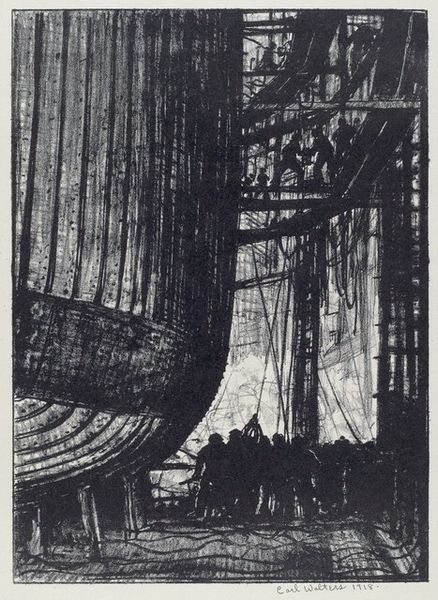 Curator: Muirhead Bone's "On the Stocks" presents a dynamic depiction of shipbuilding, though the exact date remains unconfirmed. Editor: It feels claustrophobic, almost oppressive. All those crossing lines and heavy shadows. Curator: Bone was known for his ability to capture industrial scenes, like shipyards, with meticulous detail. This print provides a fascinating glimpse into the labor and scale involved in early 20th-century construction. We can see how these efforts, whether on land or sea, are tied to socio-economic progress. Editor: But also, let’s consider the human cost. The figures seem dwarfed, rendered almost invisible by the immensity of the structure. It speaks volumes about the exploitation inherent within industrial capitalism. Curator: Perhaps. Bone was commissioned by the British government during both World Wars to document industrial efforts, which can be considered an act of propaganda. Editor: Right, so the celebration of progress is intertwined with the machinery of war. We can examine the artist's role within these larger historical events. Curator: A compelling perspective. It's important to contextualize art as a reflection of its time. Editor: Exactly. And to question whose voices are amplified, and whose are silenced within these narratives.