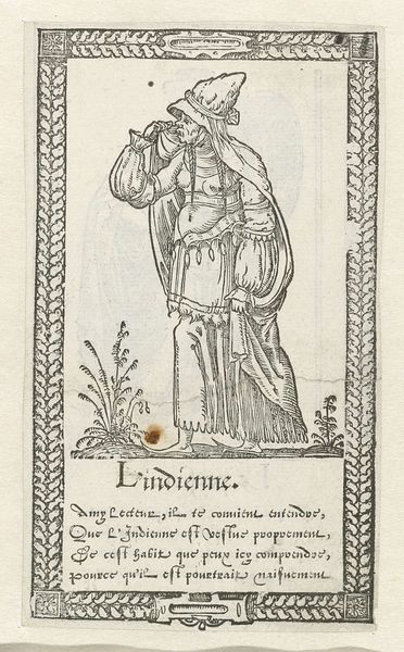 Curator: Stefano della Bella created this print, "Vrouw uit Armenië," sometime between 1620 and 1664. It resides here at the Rijksmuseum. Editor: My first impression is one of controlled elegance, yet there's an unsettling gaze, a presentation of something more complex than pure aesthetic. The crisp engraving amplifies that feeling, doesn't it? Curator: Indeed. Let’s delve into the engraving process itself. The labor involved in creating such fine lines would be significant, think about the artist meticulously etching the copperplate, working and reworking to achieve this level of detail. Editor: Agreed, and all to transmit cultural data. I am curious about the symbols woven into her clothing and headdress. What do they communicate about her status and Armenian identity? The inclusion of the headdress speaks volumes, towering with those feathers, demanding attention, setting her apart. Curator: Certainly the garment indicates the influence of the trade and manufacturing occurring within Europe and how this Armenian image may function as a kind of ethnographic record produced for European consumption. It also speaks to class and access within Armenian society during the time. Editor: Note also her pose, almost inviting, her right hand extended as if to present...what exactly? Her left clutches the fabric of her gown, and that itself suggests constraint, doesn't it? A sort of veiled narrative between power and presentation. It hints at the complex dynamics within Armenian society in how they negotiate the visibility to others, of their own tradition. Curator: The act of dissemination and viewership really changes the object too; how are people understanding labor and status looking at her from entirely different context and what stories might arise. Editor: Absolutely. These details ripple outward into social context. Stefano Della Bella, through his print, prompts us to consider the intersections of identity, material culture, and labor. It’s about how symbols of difference are carefully mediated to carry social meaning, after all. Curator: Precisely, and through analyzing this piece, it shows that these factors affect production. From the engraving on the plate to dissemination across a broader context, these are social and political in addition to the aesthetic consideration we often see attributed to prints.