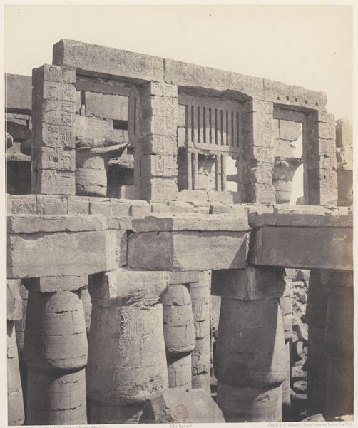 Editor: This photograph, “Louksor (Thèbes). Construction Centrale - Grande Colonnade,” was taken by Félix Teynard between 1851 and 1852. It’s a stark, almost haunting image of the columns at Luxor. The light and shadow create this powerful sense of timelessness and immense scale. What resonates with you most when you look at this work? Curator: I'm drawn to the way Teynard captures cultural memory. The sheer mass of those columns, presented in this muted palette, speaks volumes. They stand as witnesses to centuries of ritual, power, and belief. Think of the lotus and papyrus capitals – what do those plants symbolize to you? Editor: Well, I know they're both associated with Upper and Lower Egypt, right? Unity? Curator: Exactly! Teynard’s work transcends a simple depiction. Consider that in ancient Egyptian art, architectural elements weren't just structural; they were loaded with symbolic intent. These columns evoke themes of stability and order. Moreover, consider the impact of photography itself as a medium emerging during a period of intense cultural exploration and colonialism. How might the photograph itself become symbolic? Editor: That’s interesting... it almost feels like he’s capturing a moment of rediscovery, a visual record intended to document and share these ancient wonders with a wider world. Curator: Precisely! And think about how later viewers will perceive the work differently based on shifting cultural understanding and history. We are inheriting the emotional and psychological echoes of an entire civilization each time we look at it. Does that alter your perception? Editor: It really does. It's not just a picture of columns; it’s a portal connecting us to an incredibly rich and complex history, filtered through Teynard's perspective and the lens of his time. I see much more here than I originally thought. Curator: And hopefully, by considering layers of symbolic representation we remember to continue questioning how an image's meaning and importance shifts as generations evolve.