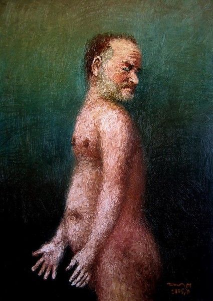 Curator: Well, here’s a piece that definitely gets your attention. What do you think? Editor: My first impression? Unexpected, to say the least. It's confronting, yet almost…vulnerable? There is something jarring about that confident stare set against the disarming, almost tawdry presentation. What am I looking at? Curator: This is "Lenin" by Alexander Roitburd, created in 2009. It's an acrylic painting on canvas. The artist puts a provocative twist on a monumental figure by portraying him in a very different light, no pun intended. Editor: Indeed. Stripping away the layers of propaganda and portraying Lenin like…this. I’m struck by the blatant iconoclasm, it almost feels punk, yet it’s clearly painted with a deep understanding of classic portraiture. It challenges the way we see symbols, particularly political ones. Does it provoke thought, or just…reaction? Curator: Maybe a little of both? Roitburd often played with challenging societal norms and perceptions, injecting a kind of sardonic humor into his works. Here he subverts this hyper-masculine and revered persona by highlighting vulnerability and even the eroticism inherent in idealized forms, while simultaneously referencing canonical tropes from art history. Editor: The golden light that illuminates the figure feels deliberate too. Like an ancient icon or a classical sculpture, drawing a comparison with those long-standing images. I imagine some viewers will feel challenged by such an image that questions familiar historical depictions. The mind does jump to thinking of the artist and his thought process... Was it just intended as shocking or to prompt further investigation and reflection of values? Curator: He's nudging at our assumptions, making us confront the difference between the icon and the individual, and, honestly, isn't that what good art is all about? He seemed to see something fundamentally ridiculous and profound at the same time. Roitburd asks how we choose to view power… Editor: Exactly. Power, image, vulnerability—it's all entangled here in this painting. It sticks with you long after you've moved on. Curator: Couldn't agree more.