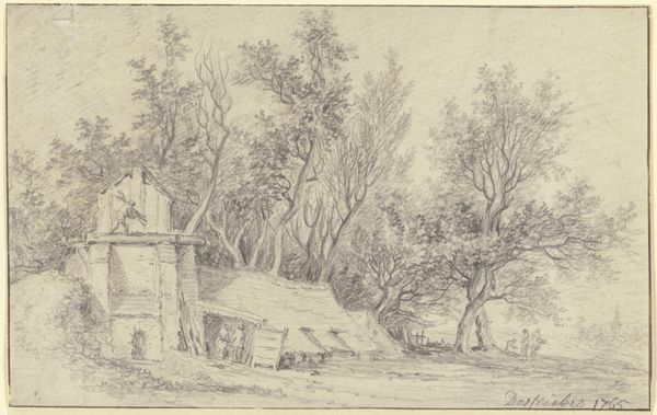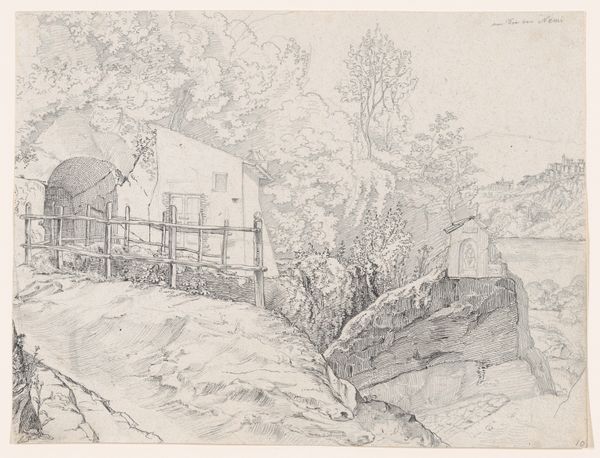 Editor: This drawing, "Farmstead in South Tirol," created in 1883 by Louis Eysen, using pencil and chalk, has such an intricate texture. The architectural forms seem softened by the artist's delicate touch. What stands out to you about the composition of this piece? Curator: The first element I would call to attention is the sophisticated use of line and shading. Eysen has masterfully modulated the pencil strokes to delineate form and space, which, although photorealistic, invites one into the visual depths through an almost rhythmic experience. Consider how the lines describing the rooftops, fence, or haystacks evoke tactility. Editor: I see that, especially in the layered lines used to define the trees. How does this linearity contribute to the overall aesthetic? Curator: It reinforces the spatial relationships and textural contrasts within the drawing. Observe how he creates a focal point at the threshold using converging orthogonals. Eysen juxtaposes the solidity of architectural masses with the permeable boundary between cultivated and uncultivated land through the interplay of dark and light, dense marks and hatching and the bareness of open spaces. This dialectical relationship heightens the experiential feeling of an inhabitable pictorial space. What conclusions can you extract by noting these formal details? Editor: That's helpful! So by understanding his mark-making, we start to decode his representational strategy and gain an appreciation for the artistic experience imbedded into the work. Thank you. Curator: Indeed. Through precise structural encoding we reveal how this landscape persists to resonate within the experiential visual field.