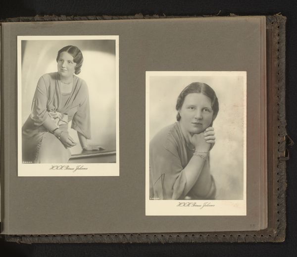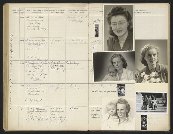 Editor: So, here we have "Portretten" which simply means "Portraits", a gelatin silver print by Flex Foto taken sometime between 1940 and 1945. They have this really interesting arrangement on a grey card. There's something nostalgic and intimate about the work as a whole. How would you interpret this collection of photographs? Curator: Well, immediately the dates, 1940-1945, trigger a certain historical awareness. Looking at these portraits, all seemingly of the same young woman, I wonder what visual cues connect them to that specific period. It's interesting to notice how photography has captured the emotional and cultural weight, particularly through changes in appearance and the staging of the image itself. Editor: It makes me wonder about their original function and why these specific images were included in this compilation, since this is an art installation from photographs that probably already existed. Curator: Precisely. Each element—the woman's hairstyles, the clothes, even the building in the small snapshot—speaks to a very specific moment and location, preserving those things beyond its moment. Think of them almost as icons of that era, not in a religious sense, but as symbols that trigger specific memories and associations tied to those times. Are these happy portraits of a loved one who may be saying farewell? Is this meant to evoke long distance dedication between families in a time of immense war? Editor: The power of an image to hold so much unspoken meaning is so interesting to consider. Thank you. Curator: My pleasure. Considering these images are now installations, their meaning grows over time, reflecting and refracting the collective understanding of a pivotal era, each impression a symbol that allows the viewer to feel the magnitude of its time.