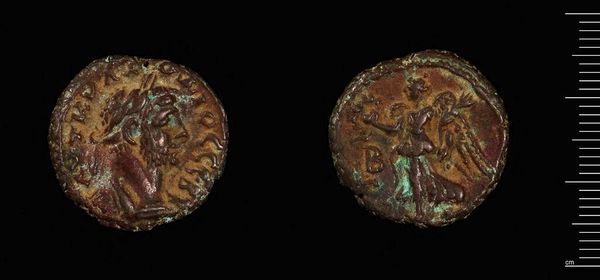 Editor: We're looking at an Antoninianus of Tetricus I, a coin held at the Harvard Art Museums. It's small, metallic, and shows its age through the green patina. What does this coin tell us about its time? Curator: These coins offer insights into the visual language rulers used to project power. During periods of political instability, like Tetricus's reign, controlling coinage was a key method to legitimize authority and communicate with the populace. Do you notice anything about the figure depicted? Editor: It’s hard to make out a lot of detail, but there seems to be a figure with a staff? Curator: Exactly. The imagery, though worn, likely alludes to Roman ideals and gods, reinforcing Tetricus's claim to the imperial legacy. Coins like these were powerful propaganda tools, constantly circulating messages about the ruler and his connection to the past. Editor: So, even something this small can reveal quite a bit about political messaging. Curator: Precisely. It highlights how even everyday objects played a role in shaping public perception and reinforcing power structures.