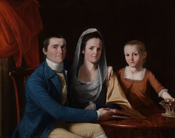 Editor: Here we have John Trumbull's "The Vernet Family," painted in 1806. It's an oil on canvas, and it strikes me as a very formal, almost stoic depiction of domestic life. What are your thoughts when you look at this piece? Curator: As a materialist, I find myself drawn to the details of production inherent in this portrait. Look at the woman's dress, its probable fabric and dye reflecting both global trade routes and emerging textile industries. Editor: So, you see beyond just the family depiction, to the resources needed to create the scene itself? Curator: Exactly. And consider Trumbull’s technique. How did his choices of pigment, ground, and brushstrokes reinforce social hierarchies or contribute to art’s changing economic value? The father's dark jacket represents somber and austere sensibility, while the light coloring in the baby’s dress represents innocence. These choices elevate, reinforce ideas that benefit the rich people. Editor: That’s a really interesting point. I hadn't thought about the materials in terms of their cultural implications. Curator: Furthermore, the work would have involved labour. Whose labour made it possible? Where were these items from, who acquired them? These are all ways to examine art that expand who gets considered "important" when analyzing such things. What are the markers of success represented in their material display, and how accessible was this to Trumbull’s contemporary audience? Editor: It gives you a whole different appreciation, thinking about the unseen labor and resources embedded in the image. Curator: Precisely! Considering art this way acknowledges the full complexity of its creation and consumption. Editor: I learned to dig a lot deeper with just a change in my perspective on this type of art! Thanks!