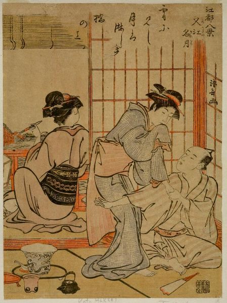 Editor: Here we have Torii Kiyonaga’s woodblock print, "The Jealous Sister," part of the "A Young Girl's Education" series. The scene feels so intimate. What can you tell us about its historical context? Curator: Kiyonaga’s work is deeply embedded in the Edo period’s shifting social dynamics, particularly concerning women's roles. The "onna e," or images of beautiful women, often reflected and shaped societal ideals. What do you notice about their expressions and interactions? Editor: The standing figure seems almost to be spying, while the seated one appears absorbed in reading. Curator: Exactly. Consider how this image might have been received by women of the time. Was it aspirational, cautionary, or something else entirely? The politics of imagery always play a part in its interpretation. Editor: I hadn't thought about it as a commentary on social expectations. Thank you! Curator: My pleasure. It's fascinating how art reflects and influences social norms.