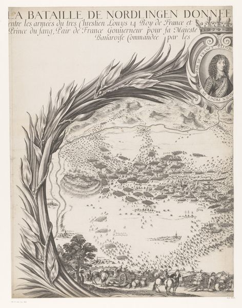 This print, "Slag bij Rocroi" (right part), was made by Nicolas Cochin sometime before 1686 using an engraving technique. The seemingly simple lines belie a labor-intensive process. Engraving demands meticulous skill, with the artist using a tool called a burin to carve lines directly into a metal plate, which is usually copper. The depth and spacing of these lines determine the amount of ink held and, ultimately, the tonal range of the print. Cochin's mastery is evident in the intricate details of the landscape, teeming with soldiers, horses, and carriages. This method of production – requiring both artistic skill and mechanical precision – has imbued this artwork with social significance. The act of engraving, replicating an image en masse, speaks to the burgeoning print culture of the 17th century and to the battle it represents. Understanding the material and the making offers insight into its cultural value, reminding us that art is not just about imagery, but also the labor and technology that bring it into being.