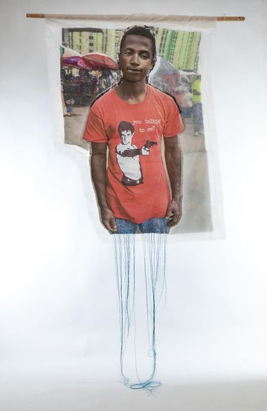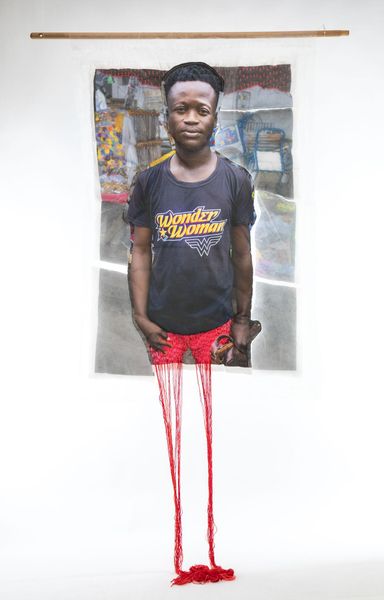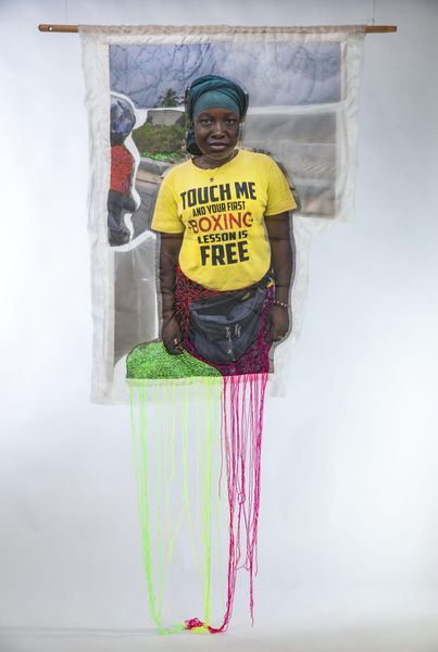 Curator: At the Harvard Art Museums we have Joana Choumali's mixed-media artwork. It’s titled "Female Equals Future" and its large size immediately draws the eye, doesn't it? Editor: It does, and I’m immediately struck by the layering; it feels like a poignant commentary on visibility and the burdens placed upon young women. Curator: Absolutely. Choumali masterfully combines photography with embroidery, challenging conventional notions of art production and pushing boundaries between art and craft. The materials themselves—thread, fabric, photographic print—speak to a fusion of traditional practices and modern expression. Editor: The slogan emblazoned on her shirt is so direct, so powerful, as a signifier of hope and potential; the trailing threads below read like anxieties or perhaps even unseen connections. Curator: I agree. The symbolism is rich. Ultimately, Choumali invites us to contemplate the multifaceted realities of women's lives and labor, and to question what futures are possible when we invest in female empowerment. Editor: It’s interesting how the artwork makes you think about what is literally holding her back and how the weight she carries is both physical and symbolic. Thank you for that view, it's a lot to consider.