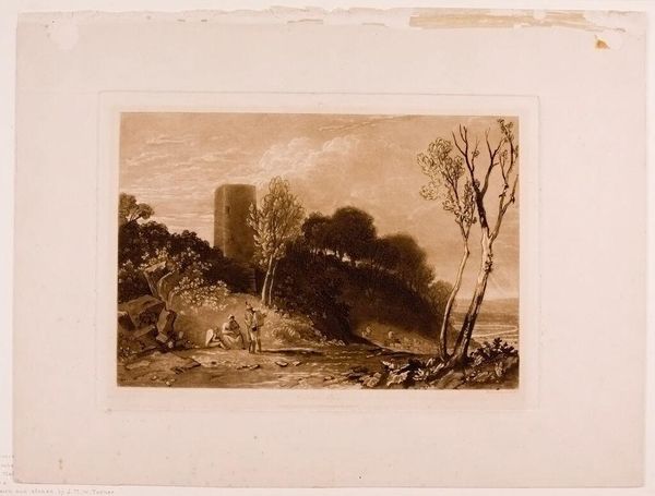 Editor: We're looking at J.C. Easling's "Winchelsea, Sussex," a sepia-toned print that feels both historical and a little bit dreamlike. There’s a tower, a small gathering of people, and a general air of peaceful contemplation. What draws your eye in this particular landscape? Curator: It’s funny you say “dreamlike,” because it does feel like a memory, doesn't it? The sepia tone lends this sense of nostalgia, like looking at a faded photograph of a place you’ve never been, but somehow feel you know. Notice how the tower almost blends into the sky, creating a sense of timelessness, a whisper of history on the horizon. What do you make of the figures? Editor: They seem almost incidental, small against the landscape, yet they add a human element to this otherwise serene view. I guess they emphasize our connection to the past? Curator: Exactly! They’re a reminder that landscapes are never truly empty, but always shaped by human presence and experience, even when that presence is only hinted at. It really speaks to the power of art to preserve not just images, but feelings too. Editor: That makes me see the artwork differently! Curator: As it does for me, too!