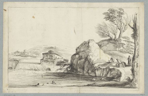 Curator: This is Dr Thomas Monro’s, A Cliff beyond a River, part of the Tate Collection, though its exact date is unknown. Editor: There’s a quiet melancholy here, isn't there? The lone figure seated by the riverbank under a looming tree, dwarfed by that monumental cliff... it almost feels romantic, but with a touch of isolation. Curator: Yes, Monro's landscapes often explore the relationship between the individual and the sublime power of nature, a reflection of the era's focus on personal experience and the changing relationship between humans and their environment. It raises questions about who has access to the sublime and what the cultural implications of the natural world might be. Editor: The cliff itself is such a striking visual symbol. Cliffs often signify challenges, obstacles, or pivotal moments. The river could symbolize the passage of time, or the border between worlds. Curator: Right, and it’s important to remember that Monro, beyond his art, mentored young artists like Turner and Girtin, shaping the course of British watercolor painting. His patronage created a unique space for exploring how art could reflect shifting social and political landscapes. Editor: It makes you wonder if Monro was contemplating similar themes when he created this work. The way he captures light and shadow certainly lends an emotional weight to the imagery. Curator: Definitely food for thought! It gives us so much to consider about nature, experience, and the power of art to shape our understanding. Editor: Indeed. It's always rewarding to find layers of meaning within what appears to be a simple landscape.