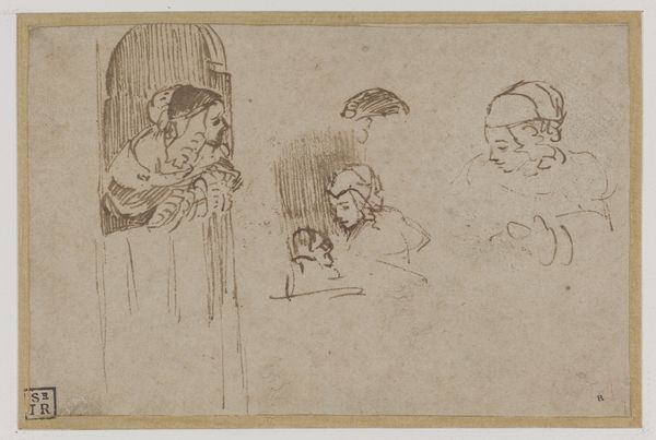 Curator: Jean-Louis Forain's 1909 etching, "Coming Out of the Hearing (first plate)," presents us with a poignant scene sketched with remarkable brevity. Editor: It has a heavy, almost mournful quality. The light is diffuse and soft. Everyone looks dejected. Is that the 'hearing' implied in the title? Curator: It is indeed. Forain, known for his engagement with social and political themes, often depicted scenes from the courtroom and Parisian life. We see figures who seem burdened by their experience. Look at the weary expressions and slumped postures of the adult figures juxtaposed with the presence of two children in the foreground. Editor: It is heart-wrenching. What stories could these figures tell? Their very posture tells me how institutional structures and proceedings deeply affect individual lives, particularly for marginalized people. Are we supposed to be observing this moment as outsiders? Curator: Forain's print possesses a compelling social commentary. The loose linework gives the impression of a fleeting moment, capturing an atmosphere of tension and vulnerability. This print resonates strongly with the prevailing political landscape in early twentieth-century France, where social justice issues were being brought to the forefront. Editor: It speaks volumes, not only to the era it was created in, but also to ongoing struggles with identity, power, and vulnerability. We see these kinds of faces every day, still coming out of similar kinds of "hearings," so the artwork feels deeply relevant even now. The starkness is the point, isn't it? The lack of resolution reinforces how many of these injustices are left unresolved, the consequences of which will linger on the subjects’ faces for the rest of their lives. Curator: Absolutely. The sketch-like quality, coupled with Forain's subject matter, makes this artwork a reflection on the social inequalities of the period. Editor: For me, that is what makes this etching so incredibly affecting. It highlights how art can encourage critical dialogue. Thanks to the artist’s deliberate choice of muted tonality, “Coming Out of the Hearing” leaves us reflecting upon our place within the larger, complicated contexts of justice and equity. Curator: It offers viewers today an enduring window onto turn-of-the-century debates surrounding institutional justice.