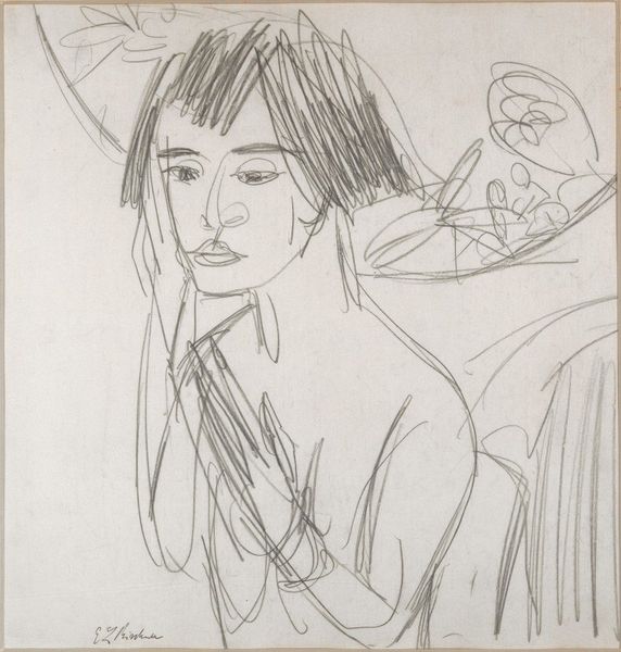 Editor: Here we have John Singer Sargent's sketch of Elsie Palmer, held at the Harvard Art Museums. It’s a very striking, almost haunting, portrait done with ink. What do you make of it? Curator: Sargent was a master of societal portraiture, capturing the essence of his subjects. This sketch, though, feels different. It's less about idealized beauty and more about raw expression. The heavy ink and quick strokes reflect the cultural shift towards artistic freedom. Editor: So, you're saying this sketch diverges from his more formal portraits? Curator: Precisely. It speaks to a moment where artists began prioritizing personal interpretation over traditional representation, challenging established norms within the art world and wider society. Editor: That's fascinating. I hadn't considered the cultural context so directly. Thanks for pointing that out! Curator: My pleasure. It’s always enriching to see how artistic choices reflect broader historical shifts.