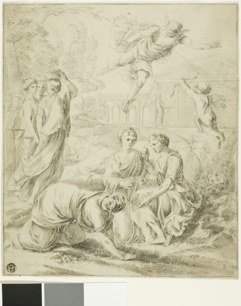 Curator: Giuseppe Zais offers us his rendition of The Annunciation, a pen, ink, and colored pencil drawing dating sometime between 1736 and 1770, presently housed at the Metropolitan Museum of Art. What strikes you about it? Editor: There's an ethereal quality to it. The soft washes of ink, the figures emerging from and dissolving back into the light... it feels very dreamlike. A bit melancholy, almost. Curator: Indeed. The Baroque style, even in this relatively simple drawing, often leaned towards dramatic expression. Consider how this work participates in, or perhaps deviates from, typical depictions of this very charged, and political scene of Mary's annunciation. Editor: Right, and looking at the symbolism, the dove, of course, representing the Holy Spirit, descending with a literal beam of light... that visual metaphor carries immense weight. And the angel, bearing the lily, a symbol of purity and Mary’s virtue, poised on a cloud – these aren't just pretty details; they are the anchors of meaning. Curator: Certainly, these elements, familiar from centuries of artistic interpretations, were instantly legible to its intended audience. This wasn't just aesthetic enjoyment; it was a reinforcement of cultural narratives and doctrines, communicated through universally understood imagery. Editor: The positioning of the angel seems unusual; one might consider him to be offering, or even pushing, the Holy Spirit’s light towards Mary. It creates an intensity – almost a coercion – in the image that isn't always as pronounced in other depictions. What does this say of the church's attitude during Zais's cultural context? Curator: That's astute. It speaks to the complex and often forceful role the church played in people’s lives, and indeed in political circles. The Annunciation wasn't merely a devotional image; it was a statement of power, translated through the language of art. Editor: And it’s that power that resonates even now, however subtly. Beyond the purely religious meaning, we can appreciate the intricate language of symbols. A silent vocabulary shared through ages. Curator: Absolutely. Zais has provided us not only an exercise in devout image making, but has made the historical context legible through his visual and artistic choices.