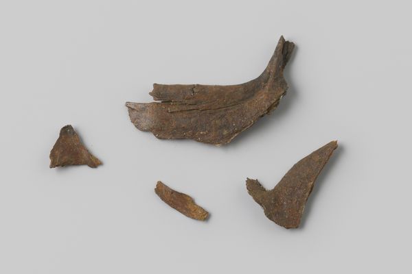 Editor: This is "Collar of a Sleeveless Jacket" from around 1830, author unknown. Seeing it now, the degradation gives it an oddly compelling presence, don’t you think? It's simultaneously ghostly and substantial, as if it’s carrying untold stories. What do you make of this lone object, a relic from a bygone era? Curator: Oh, I completely agree! It *is* ghostly, isn't it? Almost like a memory fragment solidified into ceramic. I imagine this collar cradling a neck, shielding a voice now silent. Think about it – what secrets could this fragment whisper about its former owner's life? Was it a regal lady, a hard-working artisan, or perhaps someone caught between? Each imperfection and age spot tells a story. Do you think it's sad or beautiful? Editor: That's such a lovely thought. Maybe… melancholically beautiful? This surviving piece is a bit sad, it sparks my curiosity so much. And thinking of it that way, what material would that ghost be made of? Curator: Maybe ceramic dust swirling in time like memories, what about you? It’s like poetry isn’t it? This unassuming object turns into something so alive in your hands, you have opened it up and gifted it back to me! Thanks to your question it changed completely. Editor: This has been enlightening – thank you for sharing that with me. This idea gives me chills. I’ll never look at historical fragments the same way again. Curator: Neither will I. Thank you.