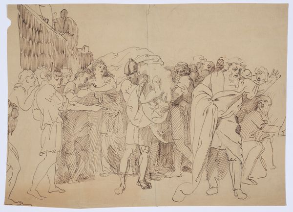 Curator: Here we have Roger Fenton's pencil drawing on paper, created around 1855, entitled "Sebastopol, Graves of English officers." Editor: The first thing that strikes me is the starkness of the composition. A very linear narrative with precise detailing in the figures dominates this work, evoking a solemn procession. Curator: Absolutely. Observe Fenton's deliberate arrangement of figures within the frame. The linearity underscores a deliberate composition, reinforcing a theme of historical weightiness. He has paid meticulous attention to the costumes, almost as if inventorying rank. Editor: Thinking about Fenton's historical context as a pioneering war photographer is key. Pencil offered a portable medium, allowing him to create these records under adverse conditions. What does the use of the pencil imply here versus photographs? How do pencil strokes themselves inform its creation? Curator: Good questions. While photographs captured immediacy, drawing offered a degree of control and idealization for representing history. We might consider the historical convention here and see it almost as history painting. The crosshatching of his pencil lends a softness to a serious occasion, but also flattens the depth. Editor: It’s remarkable to consider that each precise line demanded direct physical interaction, a labor that reveals a complex tension between documenting the battlefield and crafting an artistic creation. Consider also the availability of photographic materials, photographic paper, in comparison to a pencil, during wartime. Curator: I would suggest his deliberate layering, building the tones almost sculpturally, achieves monumentality through tonal structure. There's a clear hierarchy: more emphasis on clothing and facial features than say the background, indicating a desire to focus on what these men represent. Editor: Indeed, contemplating the paper Fenton chose can tell us more about how artwork embodies historical contingency in its physical form, challenging us to investigate both labor and cultural expression intertwined. What are we really looking at: An artwork or an accounting? Curator: That interplay between history, labor and artistry reveals Fenton's fascinating exploration. Editor: Precisely, Fenton gives us cause to consider all the levels of artistic creation through available mediums, a complex perspective that transforms our reading of his pencil drawing.