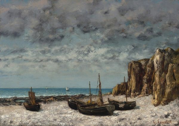 Gustave Courbet captures the Cliff at Étretat with a focus on its imposing natural arch, a form that resonates deeply within our collective visual memory. The arch, a symbol present since antiquity, is reminiscent of Roman triumphal arches, gateways to new beginnings, and passages from one state to another. Here, however, Courbet’s arch is not man-made but a product of nature's own forces, eroded by time and tide. Consider its presence across cultures – from ancient temples to gothic cathedrals – the arch signifies transition and transformation. In viewing this cliff, we might recall similar natural formations depicted throughout art history, each embodying a sense of awe and the sublime. The arch becomes more than just a geological feature; it is a symbol of endurance, a silent witness to the passage of time, evoking feelings of both vulnerability and resilience within us. This powerful engagement leaves a lasting impression, echoing through the corridors of our cultural psyche.
