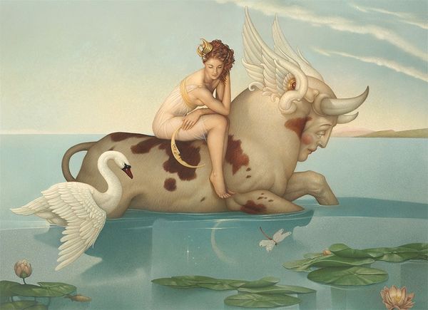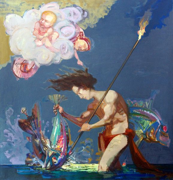 Curator: Jana Brike's painting titled "Melancholia" presents us with a rather striking image. What's your immediate response? Editor: It feels strangely… unsettling. The turbulent sea dwarfs the small boat carrying these figures. The overall tonal range is limited with the muted colors and values, which enhances the melancholy of the piece, even without knowing its title. Curator: Indeed. There's a clear narrative at play here. It places girl-like figures within the wreckage of childhood hopes. Look at how the graffiti scrawled on the boat contrasts with their delicate features. Editor: I'm immediately drawn to the textures. Brike masterfully plays with contrasting smooth skin against the rough, painterly quality of the wave. Notice too, how the light catches the foam – it gives the water almost a threatening life of its own. Curator: This reflects the painting’s cultural context, perhaps a commentary on contemporary issues related to the loss of innocence or even the anxiety felt by youth in the face of the uncertain present and future? The imagery hints at vulnerability within overwhelming societal forces. Editor: Semiotically speaking, the wave itself could represent these overwhelming forces—its violent curvature forms a natural frame almost enclosing the girls. The scale creates this emotional impact but the colors have their role. Blue typically suggests sadness, in addition to open spaces, the sky, and sea. Here, both aspects coexist and enrich the composition. Curator: Exactly, and you can see it in her practice of art being closely tied to fairy tales and children’s book illustrations which are usually filled with symbolism related to hope, danger, and the path of self-discovery. "Melancholia" takes this symbolic language into uncharted territories, using powerful iconography to speak to social narratives. Editor: Agreed. There is something unnerving and profound. It balances a beautiful aesthetic with a complex network of implied feelings and meanings. I'm walking away feeling deeply contemplative. Curator: The power of art lies here: Brike delivers a poignant visual commentary through form, and by viewing such paintings, the museum acts as the center point for culture to foster empathy and promote dialogue about difficult subjects.