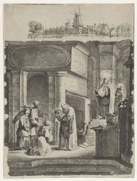 Editor: This is Rembrandt van Rijn's "Jews in a Synagogue," an etching. The space feels so intimate, almost like we're intruding on a private moment. How do you interpret this work in light of Rembrandt's relationship with Amsterdam's Jewish community? Curator: Rembrandt's positioning of the Jewish community, not as 'other' but as individuals within a specific time and place, challenges the stereotypical depictions prevalent during that era. Do you think his focus on their humanity served as a form of subtle activism? Editor: That's a really interesting idea. I hadn't considered it that way, but it makes sense given the context. Thanks for sharing your insight! Curator: Of course! Considering art through a social lens helps us unpack the complex narratives embedded within each piece.
