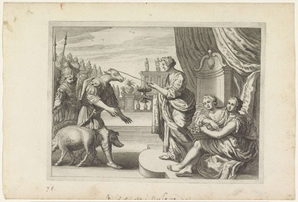 Curator: This engraving, dating to 1606, by Antonio Tempesta, illustrates an episode from Ovid's 'Metamorphoses': "Plate 135: Circe Changing Ulysses' Men into Swine." The location of this engraving is the Metropolitan Museum of Art, New York. Editor: Well, right away, I’m struck by the incredible detail achieved through engraving. Look at the textures! You can almost feel the coarse hair of the swine. The etching is really dynamic in creating that tone, wouldn't you say? Curator: Absolutely. Tempesta's Baroque style really emphasizes the drama of the transformation. Think about the context – Ovid was writing under an empire and speaking of power; this image can be read as speaking to abuses of power by autocratic rulers, transforming people into base animals, devoid of reason. The power dynamics are explicitly gendered, aren’t they? Editor: Precisely! Circe stands in command, holding a wand while extending a goblet. Her material presence is interesting in this portrayal. The objects she commands-- the goblets and the wand—become extensions of her power, physical tools of metamorphosis. Note her garments in contrast to that of the figures changing. It does raise questions about control, doesn't it? Curator: And what is being made is really quite horrifying when we consider these soldiers losing not just their physical forms, but their very identities. Are they merely victims of Circe’s wrath, or are they symbols of men debased by their own desires, transformed into monstrous forms reflecting inner corruption? And if we consider the viewer within that perspective of self-reflection, what does that make of them? Editor: Right, so much is embodied by the act of creation in this work and how it affects the individual. The medium becomes part of the story—the physical act of engraving itself mirrors the transformative act of Circe, one changing the very properties of a surface. Curator: That intersection is striking—Circe as artist or artisan, her "craft" revealing uncomfortable truths about those who seek to consume what she offers. It encourages one to consider if craft is debasing here. Editor: It does make one consider the transformative potential and moral weight of artistic making, particularly during Tempesta’s time. Thanks for elucidating the cultural relevance for me, Curator. Curator: Likewise, I found your material analysis extremely insightful; it certainly shifted my focus.
