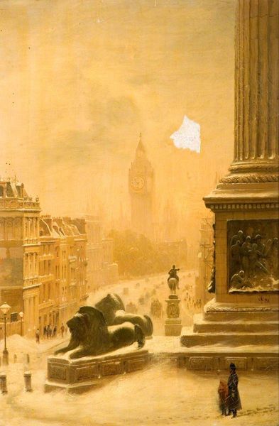 John O'Connor captured this view of Ludgate in the evening, using oil paint to evoke a sense of bustling urban life dominated by the architectural mass of St. Paul's Cathedral. The painting's structure is carefully constructed, with receding lines of buildings framing the central view towards the cathedral. O'Connor uses a muted palette of greys and browns, punctuated by the warmer tones of street lighting and shopfronts. This contrast draws the eye through the crowded street towards the monumental dome. The composition uses atmospheric perspective to flatten the distance between the viewer and the background. The cathedral looms, yet its monumentality is softened by the industrial haze. The artist masterfully plays with scale and perspective, embedding a symbol of enduring power within the rapidly changing modern city. The visible brushstrokes and texture of the paint remind us of the artist's hand in shaping our perception of this urban scene. O’Connor’s painting offers a fascinating study in contrasts, capturing the dynamism of 19th-century London, where progress and tradition intersect.