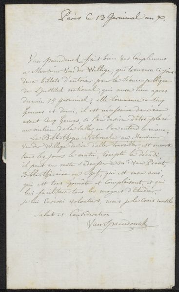 Editor: Here we have Eugène Verboeckhoven’s "Echtheidsverklaring bij een schilderij," potentially from 1842 or 1843. It's ink on paper, and it seems to be a handwritten statement of authenticity. What do you make of its materiality and purpose? Curator: As a materialist, I'm fascinated by what this document tells us about the art market of the time. It's not just about aesthetics; it's about the validation and commodification of art. The paper itself, the type of ink used, the act of writing—all these contribute to the construction of value and authenticity. What kind of labour does it evidence? Editor: I guess the artist's, and perhaps that of a paper maker? Is that relevant here, considering this artwork contains only text? Curator: Absolutely. The act of physically writing a statement connects Verboeckhoven directly to his product, adding another layer of authority beyond just his name. Consider the social context: handwritten authentication implies a personal guarantee in a period lacking today's standardized systems of verification. How does the document perform its labour? Editor: That’s a really interesting perspective. So instead of simply seeing a document, we should look at how its materiality reinforces Verboeckhoven's agency within the art world of his time? Curator: Precisely. Think about it as performative labor, a tangible declaration shaping the artwork's value. It is less about aesthetic qualities of visual representation, and more about economic systems in the mid 19th century. It opens up how materiality and validation intertwine to contribute to value and influence perceptions in the art market. Editor: I never would have considered how the materials themselves become part of the narrative! Curator: That’s the essence of the materialist approach: understanding how production and consumption create layers of meaning in art.