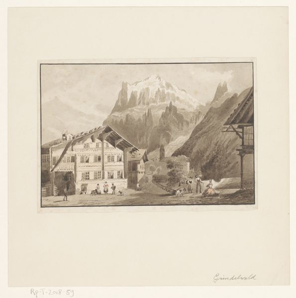 Editor: Here we have Kornelis Jacobus Huineman's "Dauphiné. La Meye," a watercolor painting from 1935. It feels a bit like a stage set, doesn't it? The village almost feels secondary to the imposing mountain backdrop. What's your read on this work? Curator: That "stage set" feeling is key, I think. Consider the timing: 1935, Europe teetering on the edge of another war. What does it mean to depict this rural scene, emphasizing its permanence against that backdrop of global instability? Is it a romanticization? An act of preservation? Editor: It's interesting you frame it that way. I was mainly focusing on the visual contrast. But could the artist be commenting on larger power structures? Curator: Exactly. Landscape painting isn't just about pretty scenery. Think about whose gaze is privileged here. Who is allowed access to this picturesque view, and who is excluded? The peasants working that land? Or wealthy tourists seeking escape? This division reveals a social commentary woven into the landscape itself. And consider how the architectural ruin almost dwarfs the more 'functional' peasant dwellings...what histories of power are being hinted at here? Editor: I never would have thought of that. So, by juxtaposing these elements, the artist is making us think about wealth, class, and who controls the narrative of the landscape itself? Curator: Precisely. And isn't the very act of selecting and framing a landscape always a power dynamic? Who decides what's worthy of representation, and what remains unseen? Editor: This makes me reconsider landscape painting. It’s far more complex than I initially thought. Thanks for shedding light on all those layers! Curator: Absolutely. And the key takeaway here is that even seemingly "simple" landscape holds complex social, historical, and political narratives. We just need to look closer.