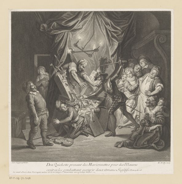 Editor: This print, "Christian Receives the Letter of Defiance," made between 1785 and 1833 by Christian Gottfried Zschoch, shows a dramatic scene, almost like a play frozen in time. What stands out to me is the weight of the moment. What do you see in this piece? Curator: Immediately, the letter becomes a central symbol, doesn't it? Notice how Christian holds it aloft, almost confronting the viewer with it. This letter, a declaration of enmity, is a loaded object, pregnant with social upheaval and personal doom. How does this public challenge disrupt private, domestic interiors? Editor: I guess that letter throws the whole room into chaos. Curator: Exactly! Consider how clothing performs cultural functions, signalling allegiance or disruption to social hierarchies. The figure on the left challenges our social codes and traditions. Do you see in their features strength or vulnerability? And how does Zschoch use light and shadow to intensify that ambiguity? Editor: It’s a bit of both, I think. His stance is strong, but the shadows under his eyes suggest uncertainty. That tension makes it captivating. Curator: Precisely! Zschoch captured that critical moment of wavering conviction. So often those about to defy the powerful must bolster themselves with displays of dominance. How else can you account for the other person's placid posture? How do you interpret that passivity? Editor: Perhaps it's acceptance of fate, or maybe feigned innocence. Curator: A superb insight. Visual imagery is powerful for exactly those conflicting possibilities. Editor: Thinking about the symbols has definitely changed my view of the piece. Curator: It’s like unlocking a hidden language, revealing layers of meaning we might have otherwise missed.