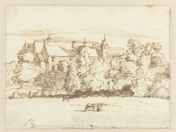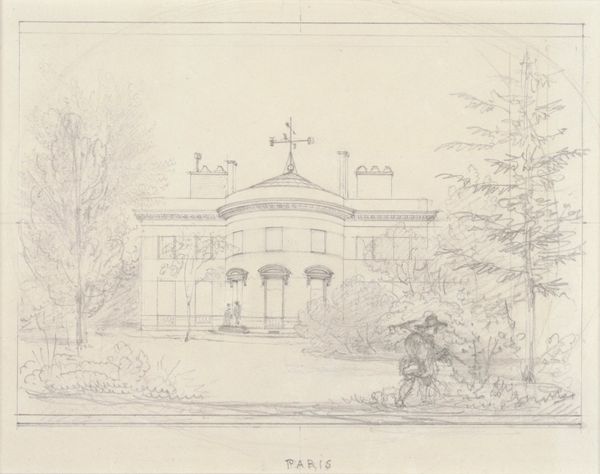 Editor: So, this is "Paleis van Fontainebleau," a pencil drawing from 1858. It's currently at the Rijksmuseum, and the artist is Gerrit Postma. It feels like a quick study, almost dreamlike. What can you tell me about this work? Curator: What I find fascinating is the almost casual depiction of such a historically significant location. Fontainebleau was a royal residence for centuries, deeply embedded in French national identity. But here, it’s presented as a quiet, personal encounter, stripped of its regal power. Postma is encountering the palace outside its normal socio-political usage, almost undermining what that power structure has to stand for. Why do you think that Postma decided to render it this way? Editor: It does seem like a very private observation. The muted tones and the unfinished quality lend a sense of intimacy. Almost like he is capturing a feeling or an emotion, rather than the palace itself. It doesn't seem at all political. Curator: But can art ever really be apolitical? Even in its intimacy, Postma's sketch makes a statement. The lack of grandeur, the focus on nature surrounding the palace - perhaps this reflects a shift in power dynamics during that period. The Palace now more like a symbol of nature rather than the monarchy? Or maybe even a critique of it? How can this informal mode capture a social observation on power structures and class structures? Editor: I see what you mean. I hadn't considered how even a simple sketch could reflect such complex issues. So, by choosing to portray the palace in this unassuming way, Postma may have been subtly questioning the established order? Curator: Precisely. Consider the Romantic movement. They often explored personal emotion and the sublime power of nature as alternatives to established authority. So, Postma’s informal depiction aligns with those values and gives the piece cultural and social relevance. What have you gleaned from the sketch? Editor: I think it's made me realize that you can read so much into a piece, even what seems like a simple study can hold so much history and culture and maybe more than meets the eye. Curator: Precisely, art holds social and cultural data that's more relevant than initially viewed.
