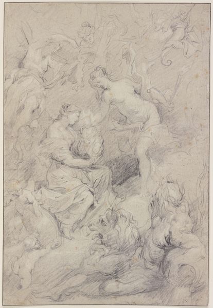 This drawing, an anonymous work held at the Metropolitan Museum of Art, presents a mythological scene in sanguine. The iconography is dominated by a female figure reclining, seemingly lifeless, attended by a winged figure, perhaps an angel or Eros. The motif of the swooning or dying figure, cradled or observed by a divine being, echoes through time. We see it in depictions of the Virgin Mary mourning Christ and, earlier still, in images of dying heroes attended by deities. The mirror, held aloft, is a particularly potent symbol. In antiquity, mirrors reflected not just the physical self but also truth and prophecy. Here, it suggests a moment of revelation or judgment. Consider how such a moment resonates – the collective fear of mortality, the desire for divine intervention. These images linger in our cultural memory, each iteration adding a layer to the symbol's complex evolution. We are drawn to them not just by their aesthetic qualities but by the profound emotions they evoke, emotions that transcend time and place.